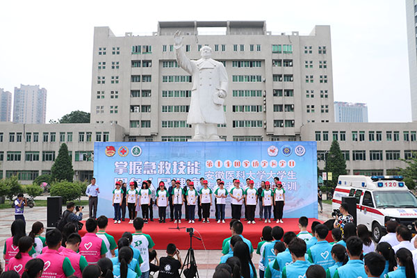 5月11日,在第十个5·12“全国防灾减灾日”前一天,在安徽省医学会、省红十字会、校医学人文研究中心的指导下,校团委、一附院联合省急救中心对我校100名大学生志愿者开展了急救技能培训活动。校党委书记李俊,省红十字会党组书记、常务副会长张青,校党委副书记刘群英,校一附院院长梁朝朝,省医学会秘书长王学东等出席启动仪式并为志愿者授帽,刘群英、梁朝朝、王学东分别讲话。