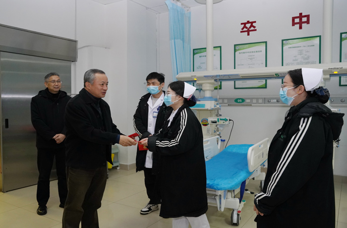 翁建平一行实地走访了住院药房、医保办、门诊服务台、收费处等各个岗位,了解春节期间医疗运行情况与服务保障情况;深入急诊小区、重症医学科、创面修复与整形美容科、呼吸与危重症医学科、内分泌与代谢病科等临床一线科室和病房,与医护人员亲切交谈,详细询问春节期间的值班安排和患者收治情况。他对大家过去一年的辛勤付出表示衷心感谢,并送上新春红包,鼓励大家在新的一年里继续保持积极昂扬的精神状态,全身心投入到医疗救治工作中。