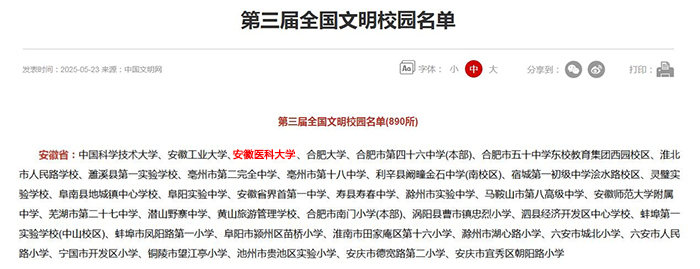 近年来,学校强化理想信念教育,大力培育和践行社会主义核心价值观,以文化人、以文育人,先后被授予安徽省文明单位、文明校园、书香校园、卫生先进单位和合肥市文明校园等荣誉称号。此次入选“全国文明校园”是学校校园文明建设的又一重大突破。