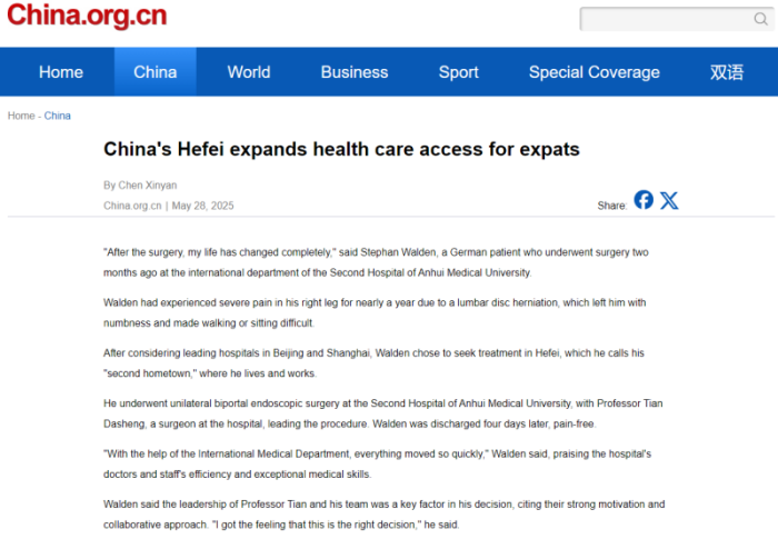 “手术后,我的生活完全改变了”“在国际医疗部门的帮助下,一切进展得如此之快”“合肥是他生活和工作的‘第二故乡’”……报道中,该外籍患者表示,医院脊柱外科主任医师田大胜教授及其团队的领导能力是他决定在合肥寻求救治的关键因素。报道还提到,近年来,为了保障外籍人士获得优质医疗服务,安徽合肥已采取措施改善医疗保健的可及性。