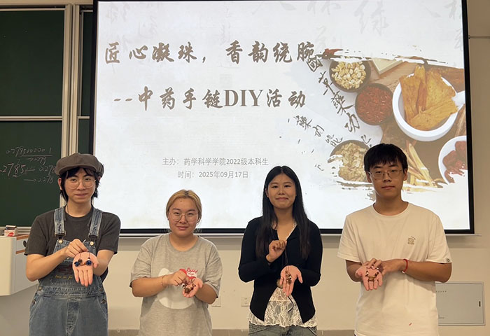结合药学特色,学院还开展了“匠心凝珠,香韵绕腕”中医药特色文创活动。同学们认真了解中草药的特性、养生功效,亲手挑选药材,沉浸式体验“穿绳引线”,制作出一件件独具韵味的中药手链,在匠心手作中感受中医药文化独特魅力,纾解学业压力。